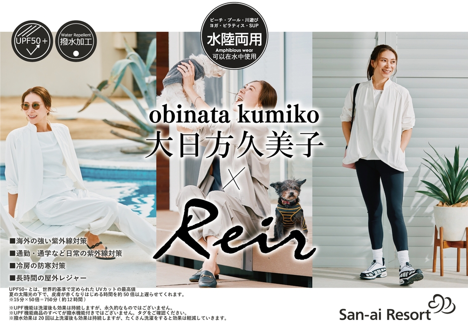スイムウェアコラボに引き続き、ファッション水着国内トップシェアのスイムウェアブランド「San-ai Resort」が展開する「Reir<レイール>」とパーソナルスタイリストとして活躍する「大日方久美子氏」との第3弾コラボレーションとして、日常使いから水辺や屋外スポーツ・アクティビティに兼用できる「超高機能水陸両用ウェア」全4型ラインナップ。