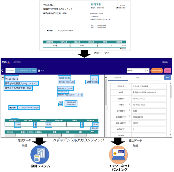 「みずほデジタルアカウンティング」は、お客様が受け取った請求書の画像データを、クラウド上のAI-OCR(人工知能搭載の光学文字認識※2)で自動読取した上で、内容確認後に伝票登録し、承認ワークフローで承認された支払データを一括選択して「振込」ボタンをクリックすることで振込支払ができる新しいサービスです。