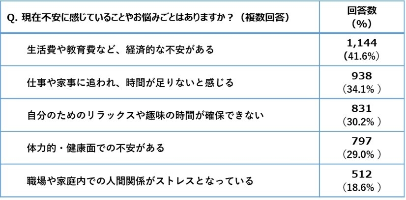 1位は経済的な不安、2位と3位は時間に関する悩み