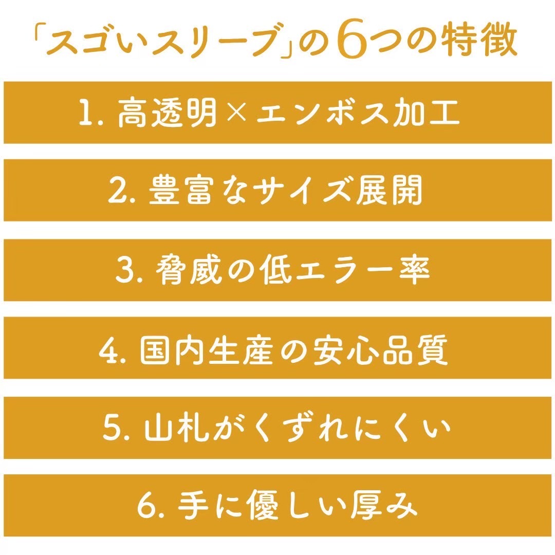 表面はクリア生地(CPP)を採用し高い透明度を実現。アートワークを損なわず、背面には凹凸加工(エンボス)を施し、スリーブ同士の貼り付きやシャッフルのしにくさを解消します。