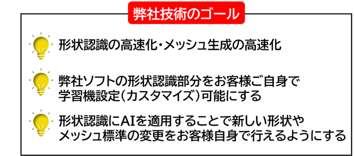 インテグラル・テクノロジー株式会社は今年秋頃の発売を目標に現在AI技術の開発を行っております。今までどこか夢物語のようだった話が実際のソフトとなって皆様のお役にたちます。弊社のAI技術はシミュレーション実験用のデータ作成段階における【形状認識】部分でご活用して頂けます。シミュレーション実験のデータ作成をするうえでCADデータから形状を綺麗に認識することは重要な一方で、人の工数を多く要して開発時間を増やす原因の一つとなっています。そこで弊社のAI技術をオススメ致します。