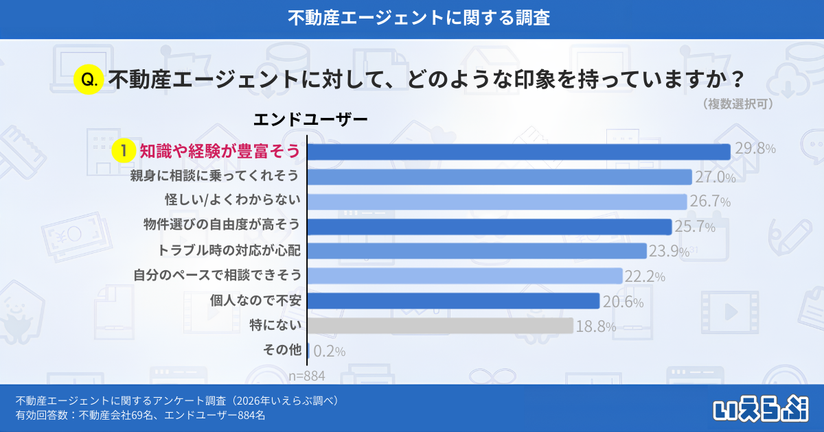 エンドユーザーに「不動産エージェントに対して、どのような印象を持っていますか?」という質問をしたところ、「知識や経験が豊富そう」という回答が29.8%、次いで「親身に相談に乗ってくれそう」(27.0%)といったポジティブな回答が上位を占める結果となりました。