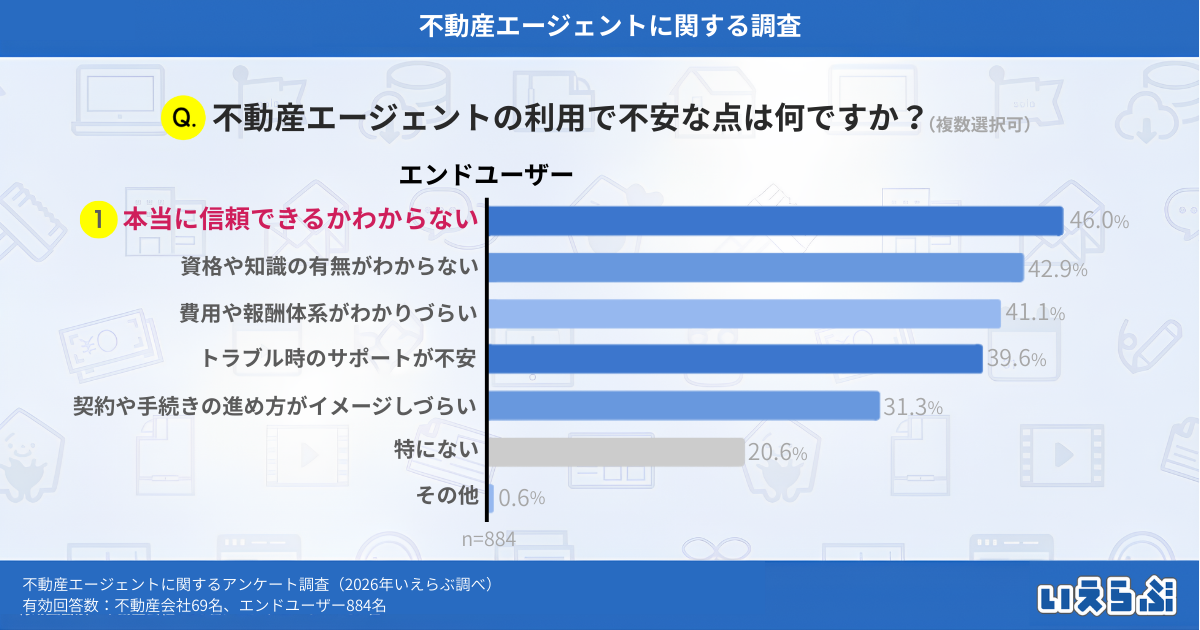 今回の調査から、不動産エージェントに対して一定の関心や期待が寄せられている一方で、認知度や信頼性、情報の透明性といった点が今後の普及における重要なテーマであることが明らかになりました。エンドユーザーは専門性や親身な対応といった質を重視しており、安心して相談できる環境が整うことで、利用の広がりにつながる可能性があると考えられます。
