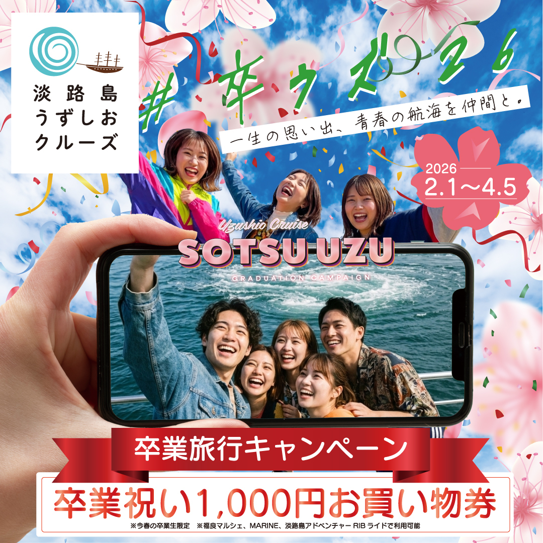 兵庫県・淡路島福良港発の「うずしおクルーズ」を運営するジョイポート淡路島株式会社(本社:兵庫県南あわじ市、代表取締役:鎌田 勝義)は、今春卒業を迎えるすべての学生を対象とした卒業旅行応援キャンペーン「#卒ウズ’26」を2026年2月1日(日)より開催いたします。本キャンペーンでは、ご卒業記念に「1,000円分のお買い物券」のプレゼントを主軸に、SNSを通じた「VIP船上体験」の抽選招待を加え、卒業生の皆様の新しい門出を全力で祝福いたします。