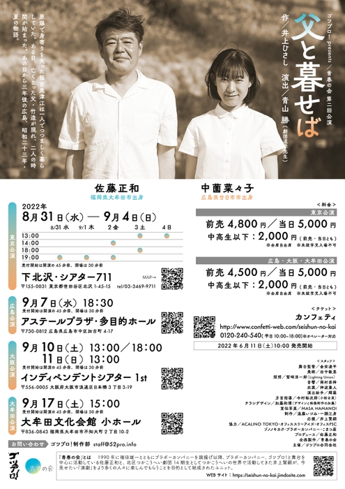 ゴツプロ合同会社主催、青春の会 第二回公演『父と暮せば』が東京・広島・大阪・福岡4都市にて上演(※東京公演は9月4日に終了)。この度、広島公演が2022年9月7日(水)にJMSアステールプラザ 多目的スタジオ(広島県広島市中区加古町4-17)にて上演されます。