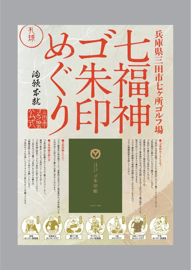 「ゴ朱印」は寺社仏閣でもらえる「御朱印」のゴルフ場バージョンのことです。ゴ朱印帳内に紹介しているゴルフ場をプレーしながら「ゴ朱印」を集めるのが「ゴ朱印めぐり」です。兵庫県三田市ゴルフ協会公式「ゴ朱印めぐり」では、三田市ゴルフ協会発行の公式「ゴ朱印帳」に市内七ヶ所のゴルフ場が発行している独自の印(シール)をすべて集めていただきます。ゴルフ場各々の特徴を七福神の神様に照らし合わせていますので、ゴルフの満願成就を目指してください。