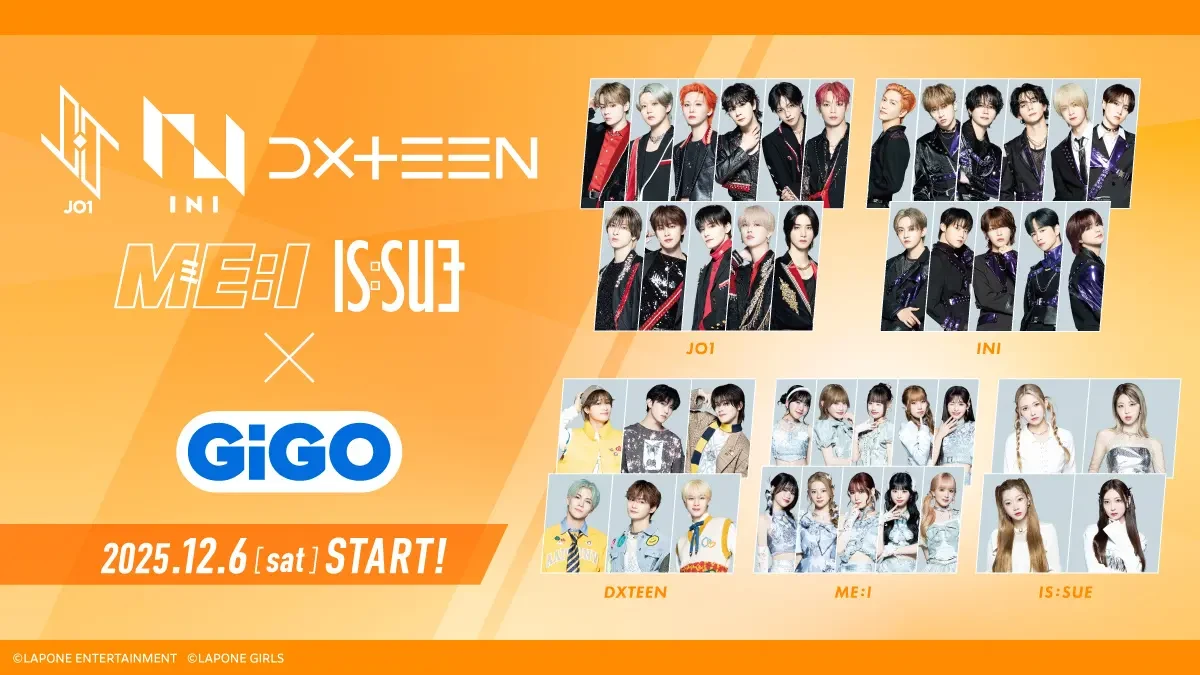 株式会社GENDA GiGO Entertainment(本社:東京都港区 代表取締役社長:二宮 一浩 以下、「当社」)は、全国のGiGOグループのお店において、LAPONE ENTERTAINMENT所属アーティスト「JO1」、「INI」、「DXTEEN」およびLAPONE GIRLS所属アーティスト、「ME:I」、「IS:SUE」のGiGOグループのお店限定景品を2025年12月6日(土)より展開いたします。