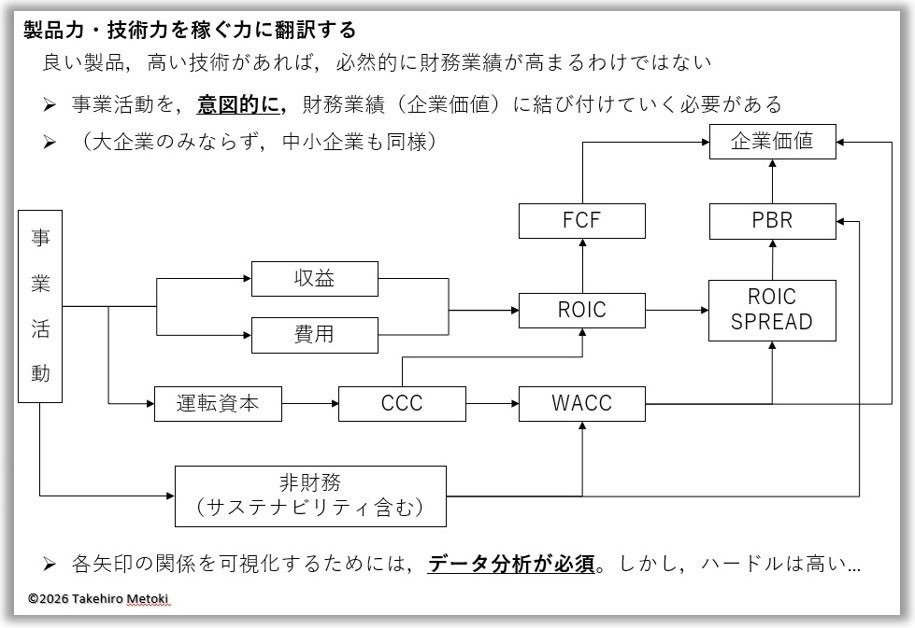 日本企業の収益力が伸び悩む中で、「データドリブン経営」はもう10年以上前からその必要性が指摘されていました。従来の日本型経営ではよく“勘と経験と度胸”と言われますが、限界を迎えつつあります。事業活動から収益・費用・利益が生まれ、それがROICにつながってキャッシュフローを生み、最終的に企業価値を高めていくという関係性を、意図的に結びつけていくようなマネジメントをしていかないと企業価値は上がらないのです。