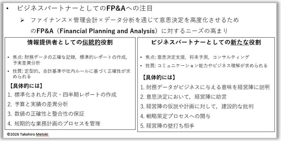 生成AIによってデータ分析のハードルが下がった一方で、会計人材の役割の変化、ビジネスパートナー化というのが非常に重要になっています。これからの会計人材はどうあるべきかが今まさに問われており、その存在意義を保ち続けられるかどうかの重大な過渡期にあると考えます。