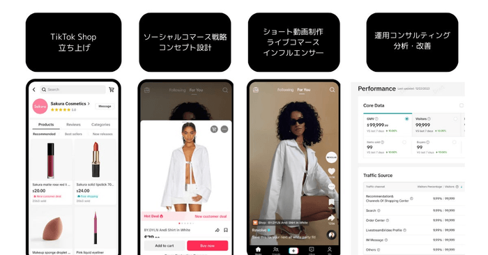 ・TikTok Shopの立ち上げ、ソーシャルコマースの販売戦略立案・コンテンツ制作・分析改善・物流配送サポートまで、一貫したコンサルティング支援