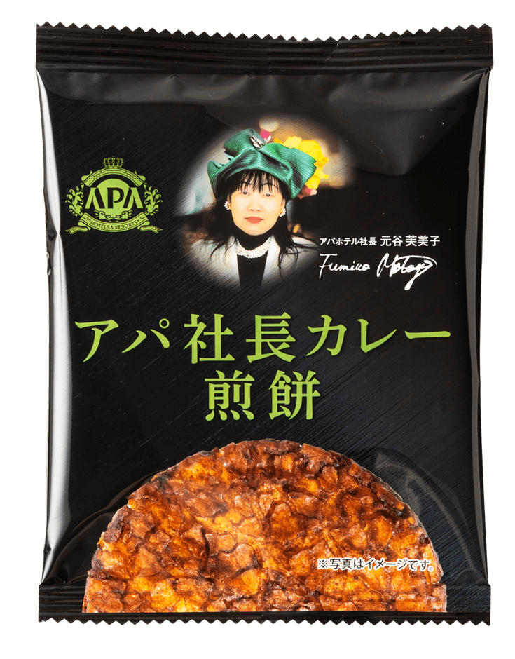 「アパ社長カレー煎餅」は「アパ社長カレー」のカレールーを使用して、オリジナルスパイスとまろやかなソースの甘みを生かした深みのある味わいを再現し、大判でさくさくの揚げ煎餅に味付けした商品です。