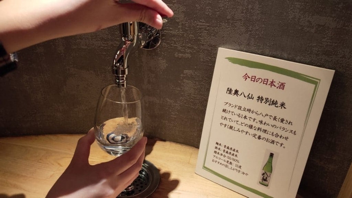 多くの方に青森県の日本酒の良さ、美味しさを知っていただきたいという思いから、蛇口式でお客様に体験いただけるようにしました。期間中は、八戸酒造、桃川、鳩正宗、鳴海醸造店、カネタ玉田酒造店の5蔵の日本酒を順番に提供しました。