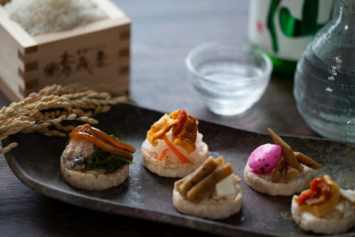 青森の文化を満喫できる宿「星野リゾート 青森屋」は、2021年7月1日に、酒蔵と酒米農家を応援するため、余剰になった酒米を活用する「酒のあで(*1)酒米せんべい」を提供開始します。これは、新型コロナウイルスの感染拡大により、日本酒の消費減少の影響を受けている酒蔵を応援する「め。青森の酒応援プロジェクト」の3つ目の取り組みです。今回は、余剰になった酒米をせんべいに加工し、酒のつまみになるように珍味、漬物を盛り付けて提供します。