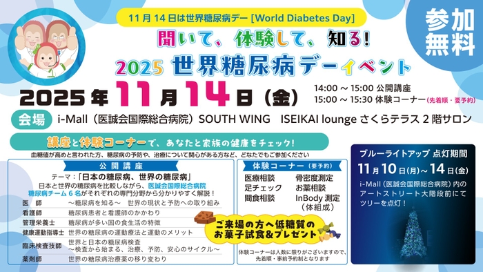 医療法人医誠会(本社:大阪市北区、代表者:谷 幸治)は、11月14日の「世界糖尿病デー」に合わせて、糖尿病の正しい理解と予防意識を広める公開講座「日本の糖尿病、世界の糖尿病」と体験コーナーを同日開催します。医誠会国際総合病院 糖尿病チームによる講座のほか、健康チェックや相談コーナーを設け、どなたでも気軽に楽しみながら参加できる内容としています。