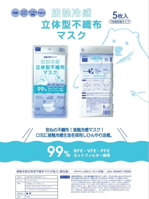 商品名 : 接触冷感立体型不織布マスク5枚入(個包装)