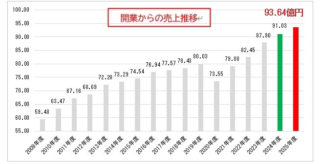 マルヤマ クラスは2009年3月に開業し、初年度年商59.48億円から10年連続で増収し、2019年度の10周年の際には年商80億円を突破。新型コロナウイルス禍を経て2022年度には2019年度の最高売上を更新。今般、2025年度に4期連続の過去最高売上を更新いたしました。