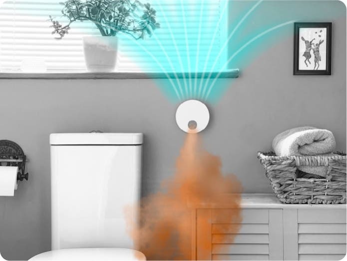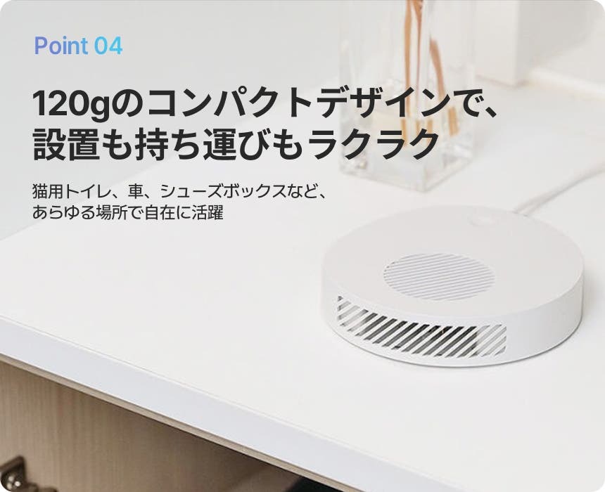 高性能でありながら、片手で持てるほどのコンパクトサイズを実現しました。コンセントがある場所ならどこでも設置可能。大型の清浄機が置けなかったトイレ、下駄箱の上、キッチン、ペットケージの横など、ニオイの発生源へピンポイントにアプローチできます。
