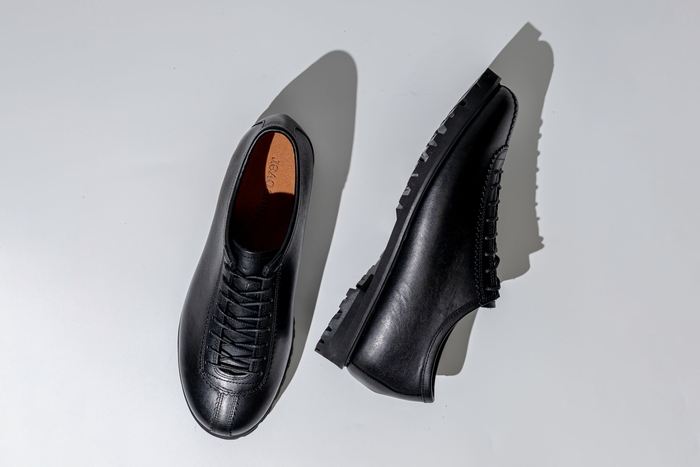 1970年代のスポーツシューズを現代的に再構築したブラックスニーカー。老舗タンナーによる上質な厚口オイルレザーはヴィンテージ感を醸し出しながら、洗練されたシルエットが特徴です。ピンキング等の細部へのこだわりと、無駄を削ぎ落したデザインはブランド哲学を体現しています。紳士靴ラスト(足型)を採用し、カジュアルからビジネスカジュアルまで対応します。ソール交換可能なマッケイ製法は、長く愛用できる一足となっています。
