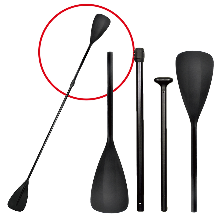 今回発売する「SUPデュアルモードパドル」は、「(1)T字型シャフト部分」と差し替え可能な「(4)パドルの付いたシャフト」というこれまでに無かったパーツを加え4本3分割構成とすることで、カヤックのパドルの様に両側で漕ぐことができるようになり、これまでSUPでは重労働とされていた着座姿勢でのパドリングを容易にすることができます。