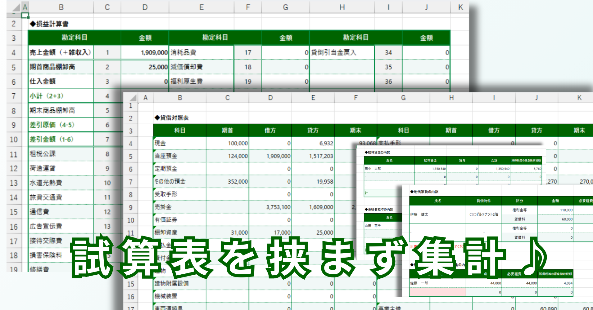 ・決算書と同じカラー(深緑)の集計: 決算書作成シートは、決算書と同じ色・並び順で設計。転記ミスを視覚的に防ぎます。