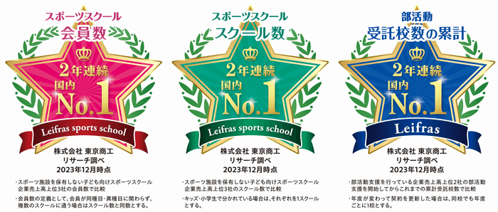 リーフラス株式会社(本社:東京都渋谷区、代表取締役:伊藤 清隆)は、2023年12月31日時点のスポーツスクール会員数・スクール数・部活動支援受託校数(累計)について調査を実施いたしました。その結果、昨年に引き続き、すべての項目で2年連続No.1を獲得したことをご報告いたします。