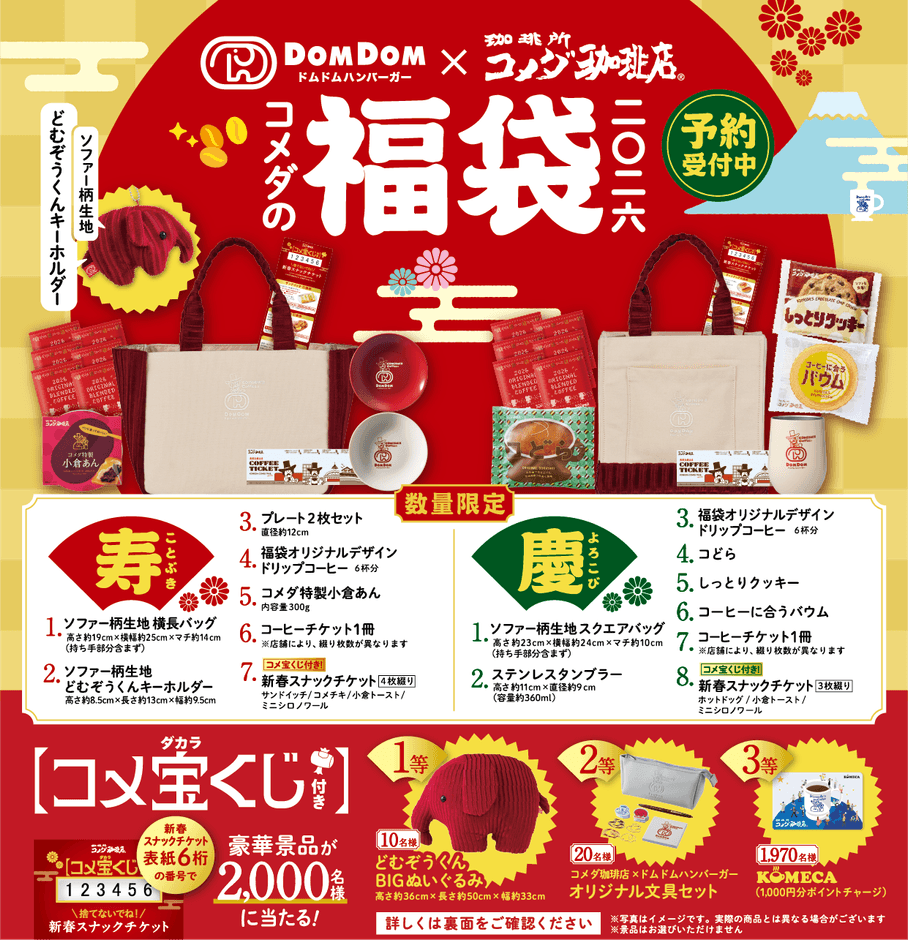 コメダ×ドムドムハンバーガー 初コラボ 2026年コメダ珈琲店の福袋「寿・慶」の2種類が登場! 2025年11月12日(水)より予約受付開始 ~豪華賞品が合計2,000名様に当たるコメ宝くじ付~