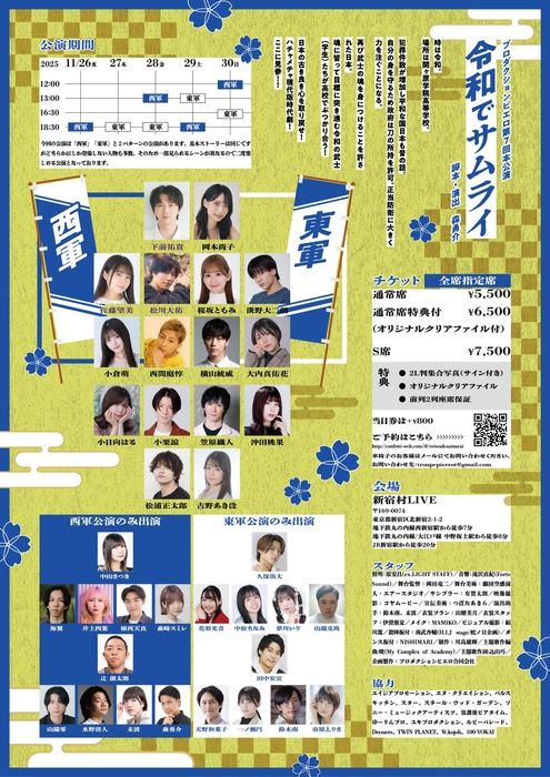 プロダクションピエロ第7回本公演『令和でサムライ』が2025年11月26日 (水) 〜 2025年11月30日 (日)に新宿村LIVE(東京都 新宿区 北新宿 2-1-2)にて上演されます。