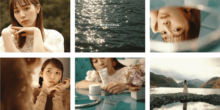 クリスティーナは私も愛用していて、とても信頼を置いているスキンケアなので、動画に出演することができて嬉しいです。短い動画の中に、たくさんの場面がぎゅっと詰まっています。清楚な雰囲気から、華やかで大人っぽいシーンまで、いろいろと演じ分けするのが楽しかったです。