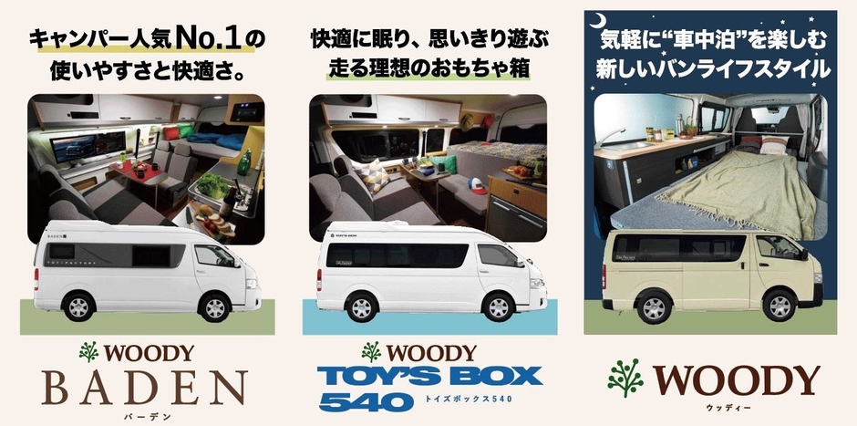 ハイエースの標準ボディ車をベースに気軽に“車中泊”を楽しむことが出来る新しいバンライフスタイル『WOODY』。ハイエースのスーパーロングバン(キャンパー特装車)をベースとしたトイファクトリーのトップセラーモデルで、キャンパー人気No.1の使いやすさ、快適さを誇る『WOODY BADEN』。“乗る”・“寝る”・“積む”の三大要素を兼ね備えながら遊び心たっぷりに仕上げた理想のおもちゃ箱『WOODY TOY'SBOX540』。