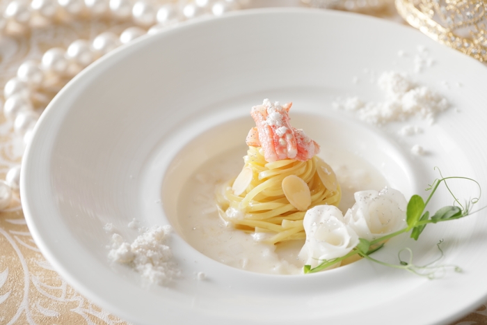 特に目を惹く“プリンセスドレスケーキ”は、ロイヤル ウエディングの主役である“マリー・アントワネット”をイメージした特別な一品。優美な佇まいのプリンセスのドレス部分は、アーモンドムースといちごジュレの2層になっており、濃厚な甘みと爽やかな酸味が楽しめる。エディブルフラワーや銀粉でゴージャスなドレスのデティールを表現。