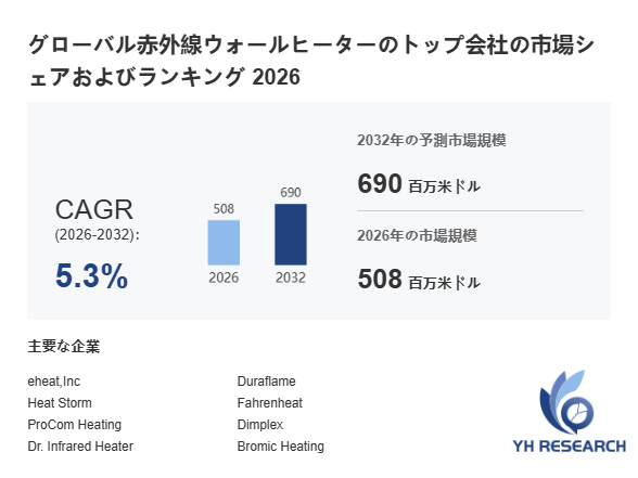 YHResearch調査チームの最新レポート「グローバル赤外線ウォールヒーターのトップ会社の市場シェアおよびランキング 2026」によると、2026年の508百万米ドルから2032年には690百万米ドルに成長し、2026年から2032年の間にCAGRは5.3%になると予測されています。