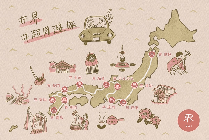 温泉旅館ブランド「界」では、日本の温泉地を周遊できる3つのコースを用意。レンタカー付きの「日本縦断コース」では、北から南まで、12日間で界11施設をめぐれます。また、航空券の付いた4泊の「九州コース」、5泊の「関東・中部コース」も用意。プランには宿泊代、一部食事代が含まれます。全国の温泉と地域文化を楽しみながら、思い出を作れるプランです。