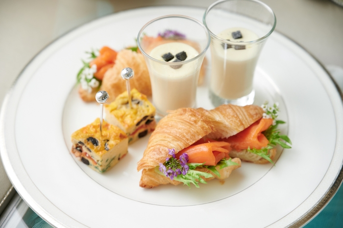 サムシングブルーとはヨーロッパにおける結婚式の伝統的な4つのおまじない“サムシングフォー”の1つで、しあわせを呼ぶ色とされる“青色”をテーマに取り入れました。ティアラやパール、ダイヤモンド、リボンなど、“結婚式”にまつわるアイテムを取り入れたブルーベースの上品なスイーツと、色とりどりの花畑を彷彿させる華やかな軽食プレートを、紅茶やコーヒーのフリーフローとともにご堪能いただけます。東京の中心地でありながら、喧噪とは無縁の緑に囲まれた非日常空間で、結婚式場ならではの“食べてしあわせを呼ぶ”おまじないスイーツをご堪能ください。