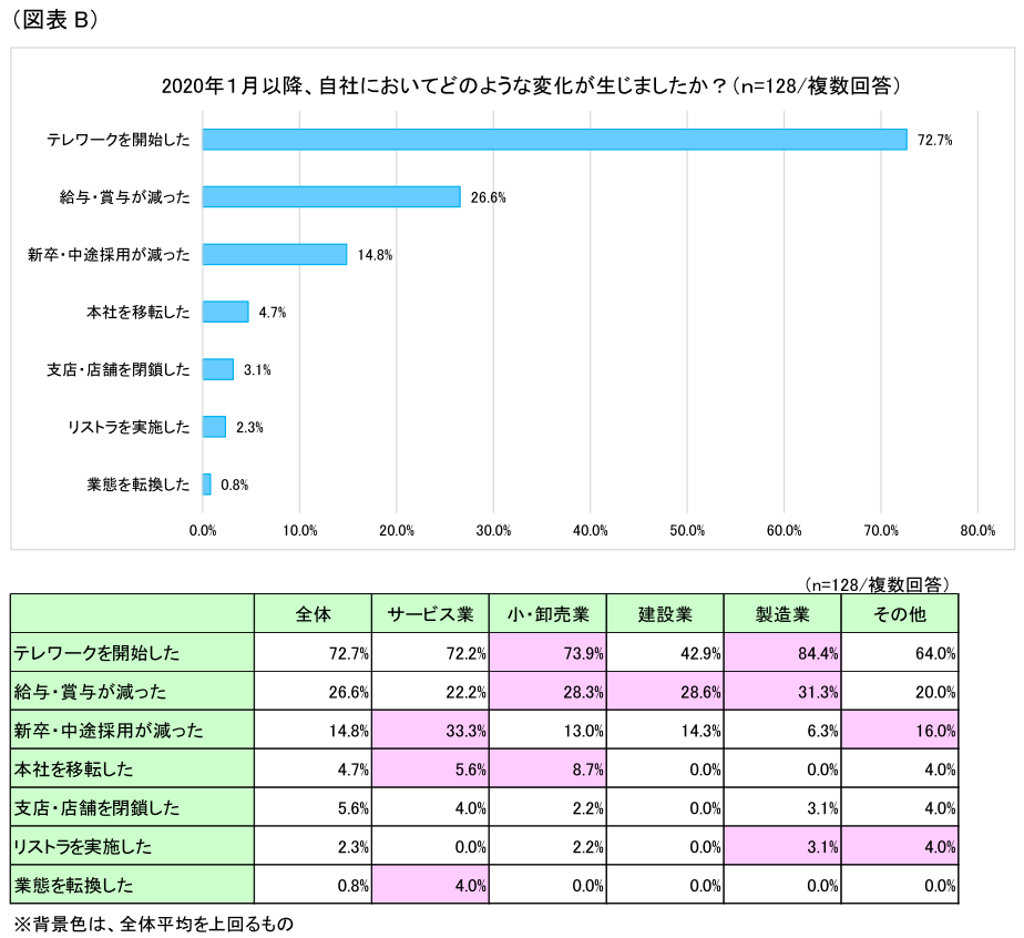 「サービス業」においては「新卒・中途採用の減少」(同33.3%)や「支店・店舗を閉鎖した」(同4.0%)が多く、来期以降の業績悪化懸念に対する固定費削減の動きがうかがえます。(図表B)