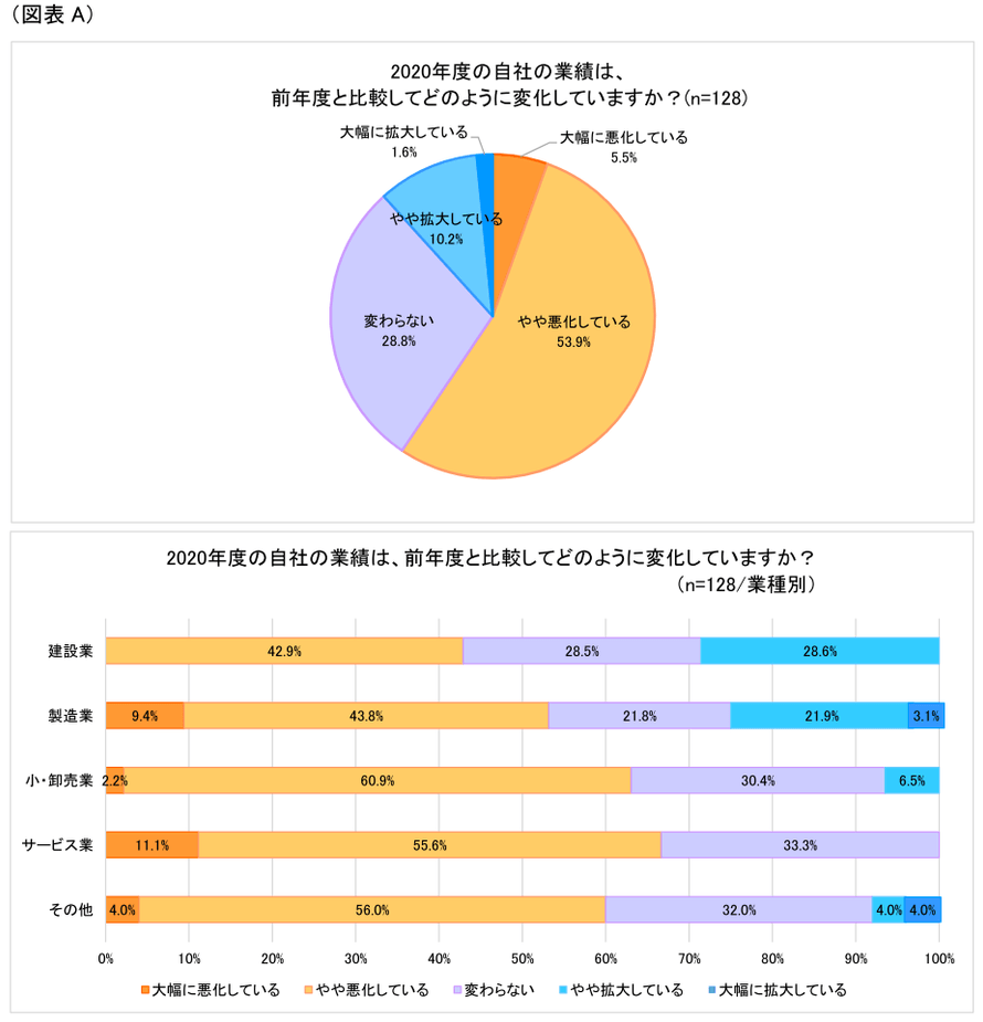 2020年度の業績について前年度からの変化を聞いたところ「やや悪化している」(回答率53.9%)が最多となり、「変わらない」(同28.8%)、「やや拡大している」(同10.2%)の順となりました。「大幅に悪化している」を含めると全体の6割の企業において前年度と比べて業績が悪化していることが明らかとなりました。