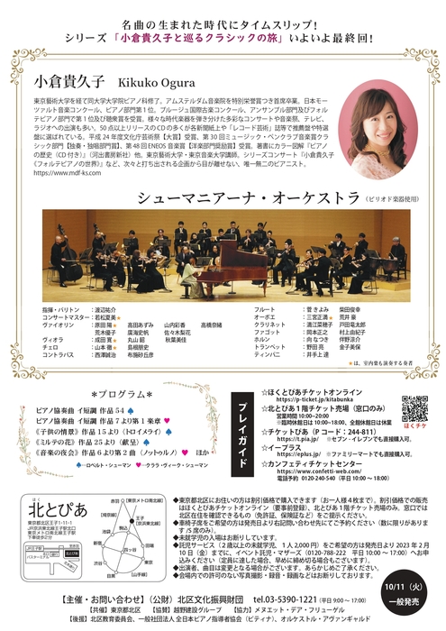 (公財)北区文化振興財団主催『小倉貴久子と巡るクラシックの旅 Vol.5 シューマニアーナ~ドイツのロマンティックな愛と詩情につつまれて~』が2023年2月18日 (土)に北とぴあ さくらホール(東京都北区王子1-11-1)にて開催されます。