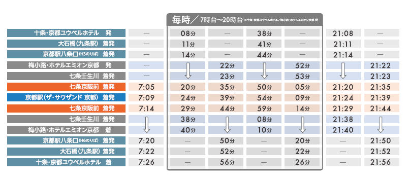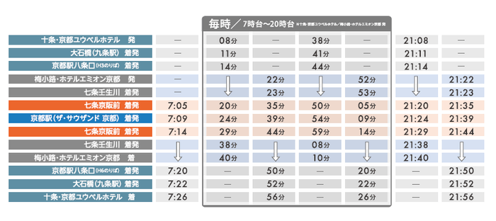 ※「七条京阪前」~「十条・京都ユウベルホテル」/「梅小路・ホテルエミオン京都」間は30分間隔で、「七条京阪前」~「京都駅(ザ・サウザンド 京都)」間は従来通り15分間隔で運行します。