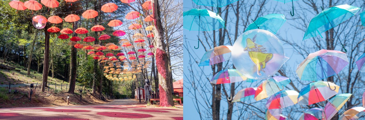 豊かな緑に包まれたパーク内では、頭上に揺れる色とりどりの傘が織りなすカラフルな景色に加え、夜間は幻想的なライトアップを実施。さらに、期間中は「ムーミン谷の湖上花火大会」を毎晩開催し、春の夜空を華やかに彩ります。また、西武鉄道飯能駅にも「ムーミン谷とアンブレラ」イベントと連動しムーミンのオブジェの上空をアンブレラが彩ります。東飯能駅ではムーミンママのオブジェがお出迎え。無料シャトルバスも運行中なので、アクセスも快適です。
