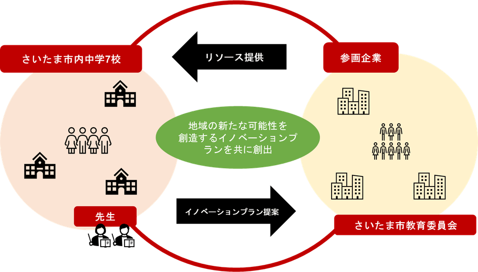 「さいたまエンジン」では、この3つのGの育成に貢献するため、今年度はプロジェクトを拡大し7校(生徒約1,110名)と13社で展開します。開かれた学校の実現に向け、「さいたまエンジン」で探究を軸とした越境型のコミュニティプラットフォームを構築し、さいたま市をさらに豊かにするプロジェクトに、中学生と企業が取り組む新しい試みとなります。