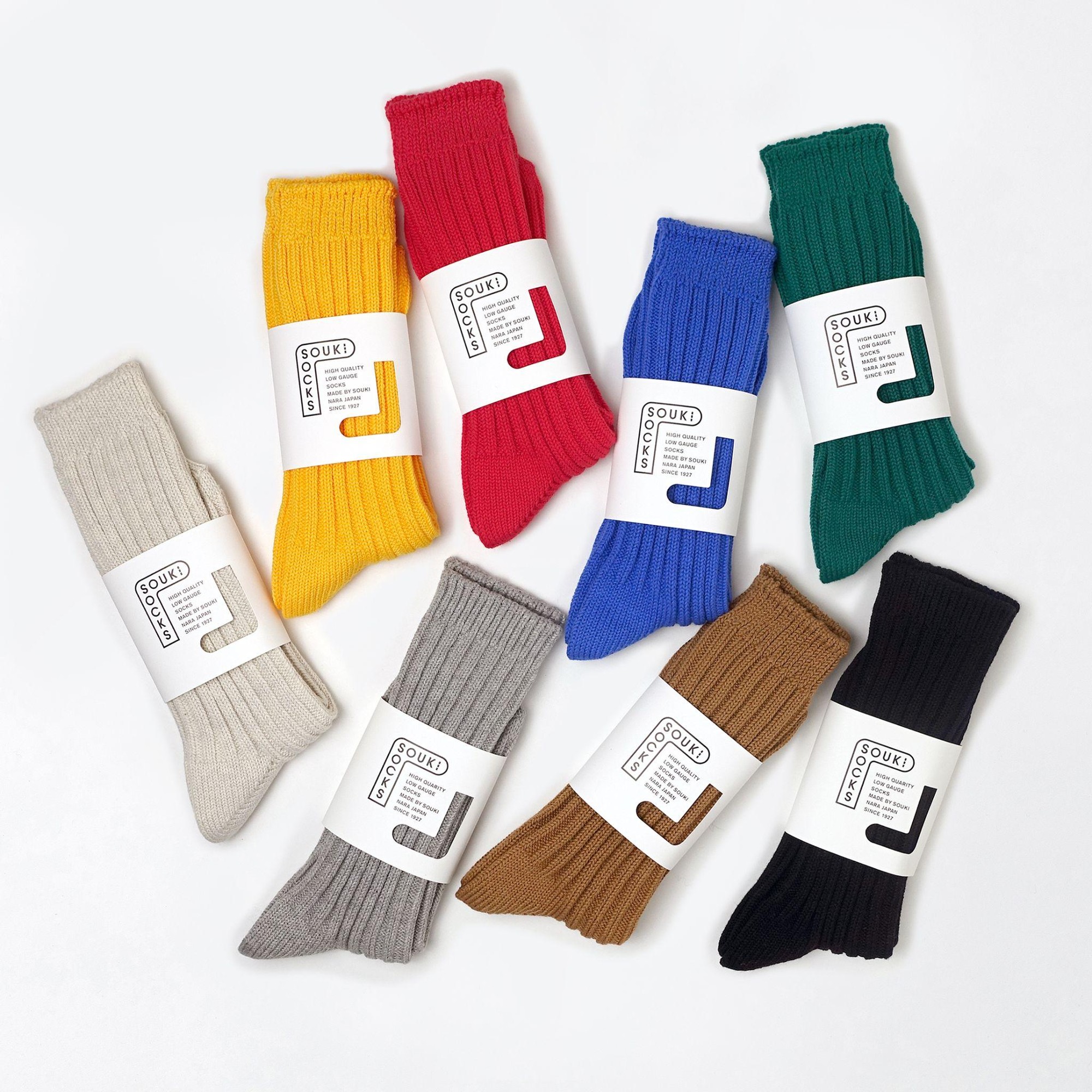 特徴:SOUKI SOCKSを代表する、コーミングをほどこしたコットン糸で編み上げた定番リブソックスの新色モデル