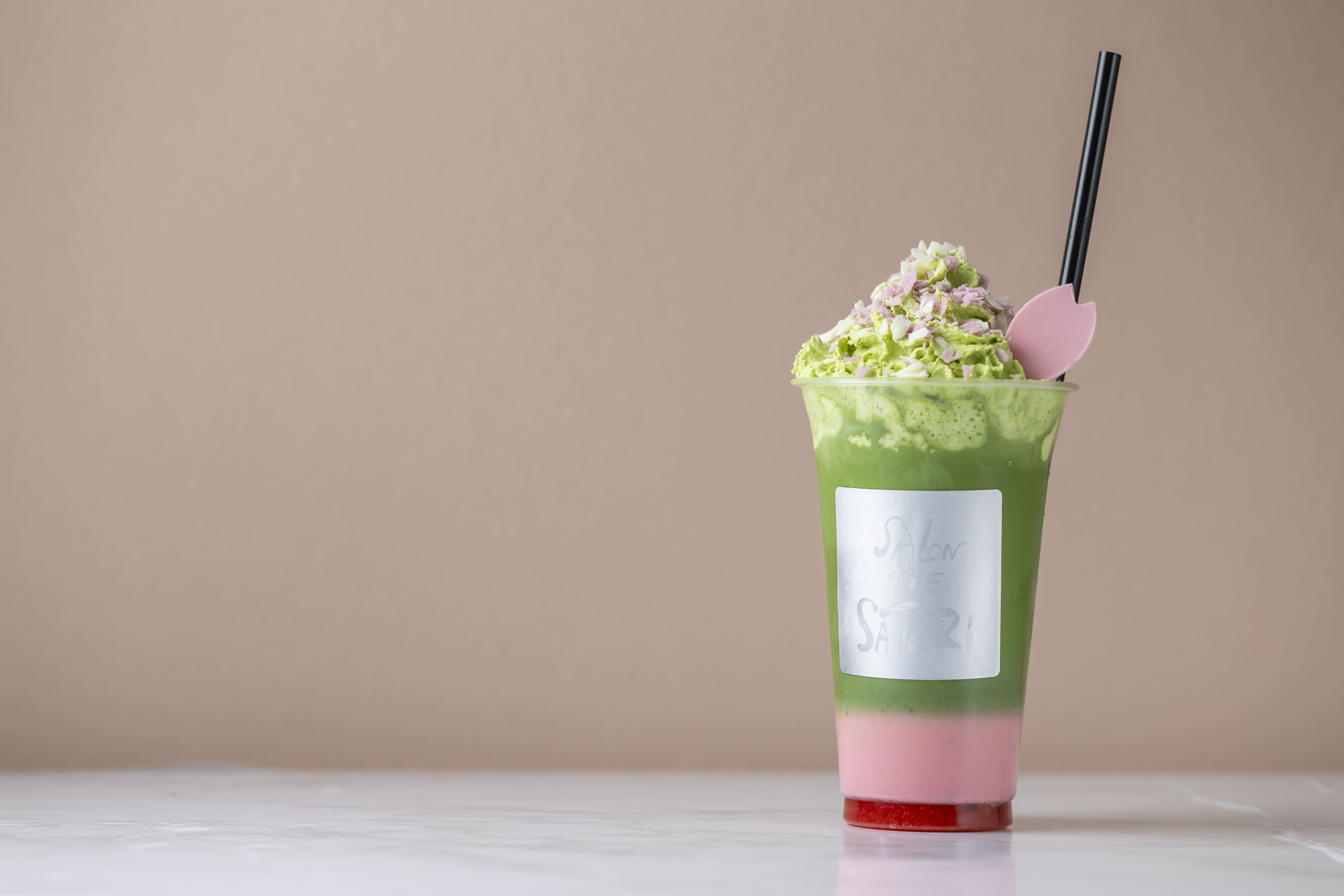 店内で練り上げたさとり自慢のお濃茶ベースと、桜香るピンク色のミルクベースでつくる、春限定の桜お濃茶ラテ。甘酸っぱいいちご桜ソースを混ぜながら、抹茶の旨味と桜の華やかな香りが溶け合う味わいをご堪能ください。