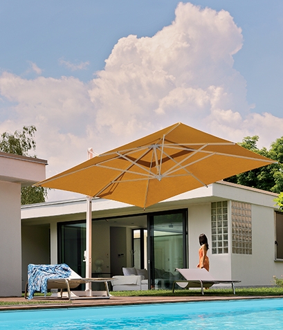 ● 4m×3mサイズのモダンでエレガントなデザインの片持ち式大型パラソル。ガーデンセットを自由にアレンジでき、おしゃれな空間を演出できます。