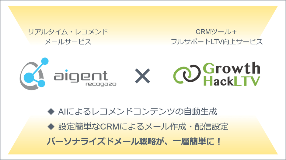 この課題に対応するため、両社はメールからのCV率300%向上の実績*を持つリアルタイム・レコメンドメールシステム「レコガゾウ」と、CRMツール「グロースハックLTV」のシステム連携を行い、少ないリソースで、訴求力の高いパーソナライズド・メールが配信できる仕組みを提供します。