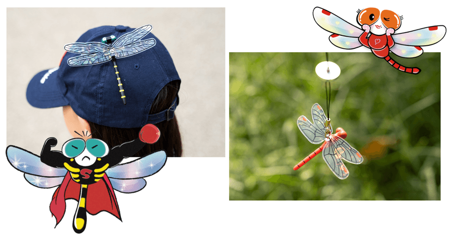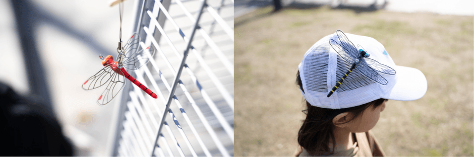 従来品と同様、オニヤンマ・アキアカネを模しながら、虫が苦手な方も手に取りやすい絶妙なフォルムはそのままに、羽にキラキラとした輝きを施し、より本物に近づけたことで虫が嫌がる要素を追加しました。
