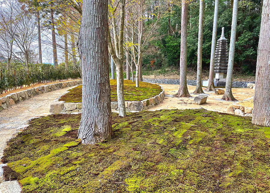 デザインの特徴は、裏山を背景として墓苑のシンボルとなる十三重の石塔を中心に、樹齢50年以上の杉や楓の既存の木立を生かし、近江の自然石に包まれた、静かな佇まい(墓苑)となっています。