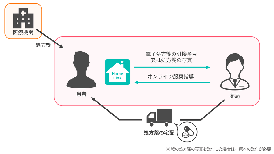 利用者は、HomeLinkアプリ上で処方箋の写真(電子処方箋の場合は引換番号)を送信し、オンライン服薬指導を予約することで、薬剤師からビデオ通話で薬の説明を受けることができます。また、アプリ上で電子決済ならびに配達の予約までを行うことができ、薬は患者さんの自宅まで配送されます。