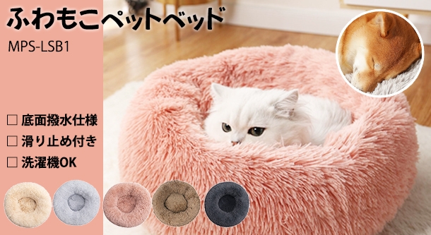 「ふわもこペットベッド(MPS-LSB1)」はシャギー素材が可愛い、秋冬向けのペット用ベッド。手ざわりがよく安心感のあるデザインと、丸ごと洗濯機で選択できるお手入れのしやすさが特徴です。弾力のある高品質のPP綿がしっかり入って柔らか。フローリング等硬い床の上でも、寛いで過ごせます。