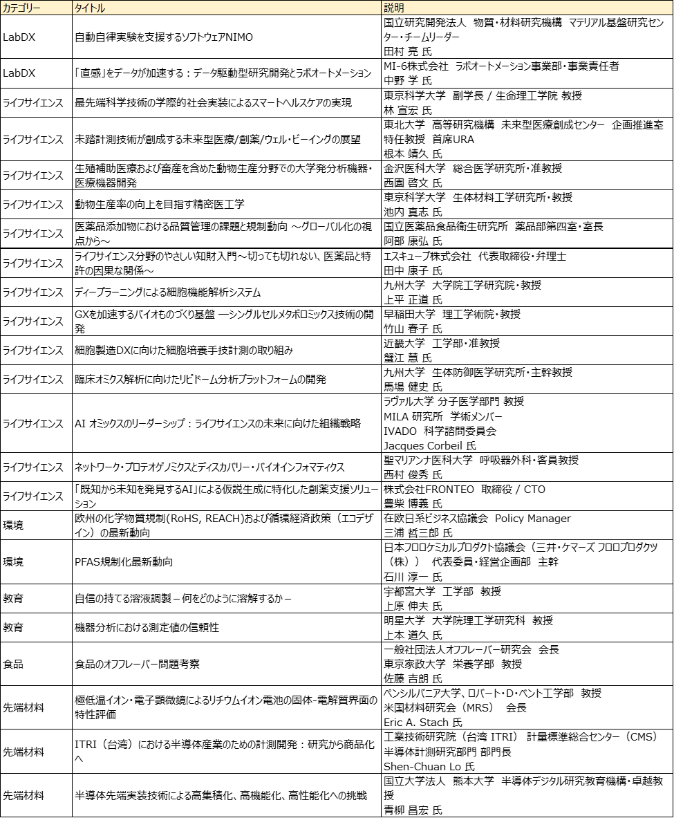 今回追加された動画コンテンツは「JASISトピックスセミナー」です。トピックスセミナーは、分析・科学機器の基礎的な知識や社会で求められている様々な課題解決に関わるトピックスにフォーカスし、専門家や有識者が講演・解説するセミナーで、2025年9月3日(水)~5日(金)に幕張メッセで開催したJASISでも36タイトルを実施し、延べ約3,300名に聴講された人気イベントです。