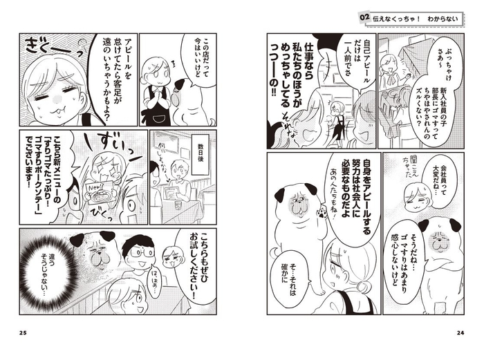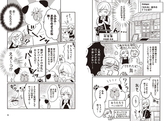 一人と一匹のキュートなコンビが「36の伝わる法則」を駆使し、試行錯誤しながらもお店を繁盛に導いていきます。