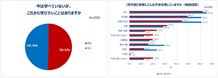 まずは女性たちの学びへの意欲を調査。「今は学べていないが、これから学びたいことがある人」は50.6%で、半数以上が学びに前向きであることが分かりました。